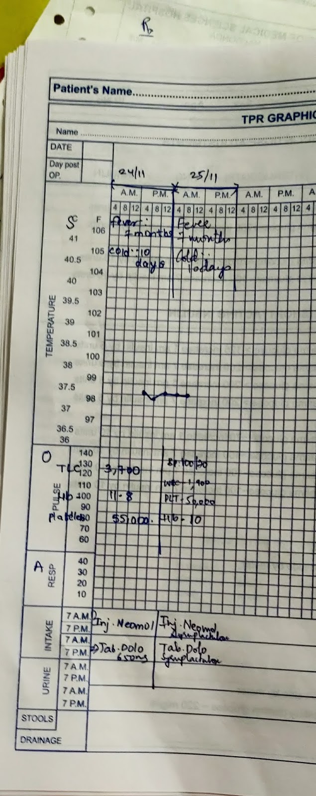 Patient had chief complaints of fever since 2 months on and off , low grade fever,increased during night,relieved on medication; gradual onset; associated with chills, pt had been feeling cold since 10 days.